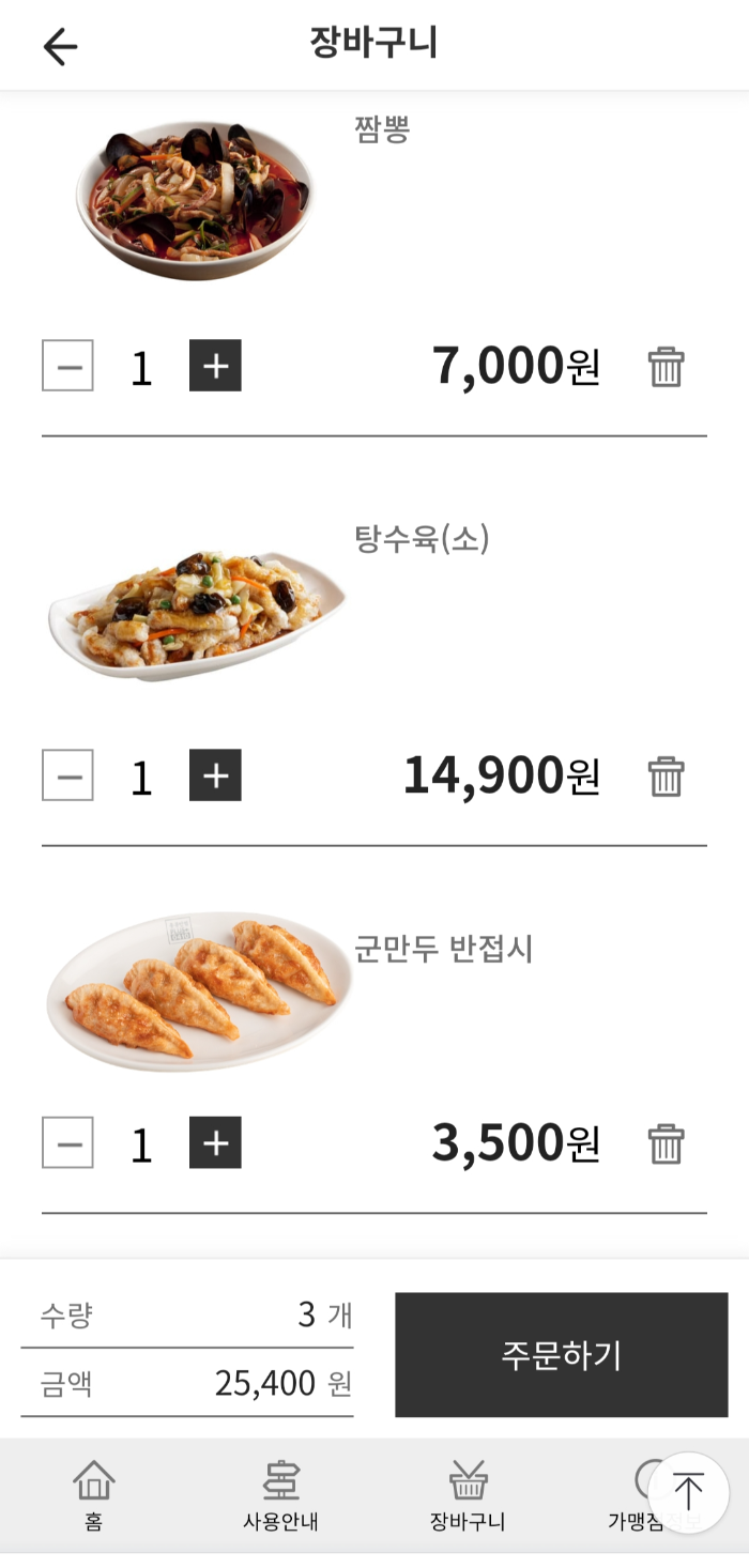 탕수육 소자(14,900원), 짬뽕 (7,000원) 군만두 반접시(3,500원)의 세가지 음식을 주문했습니다. 테이블 오더로 메뉴를 선택한 후 장바구니에 담은 음식들을 결제까지 하는 시스템이였습니다. 결제하고 음식이 나오기만을 기다려봅니다.